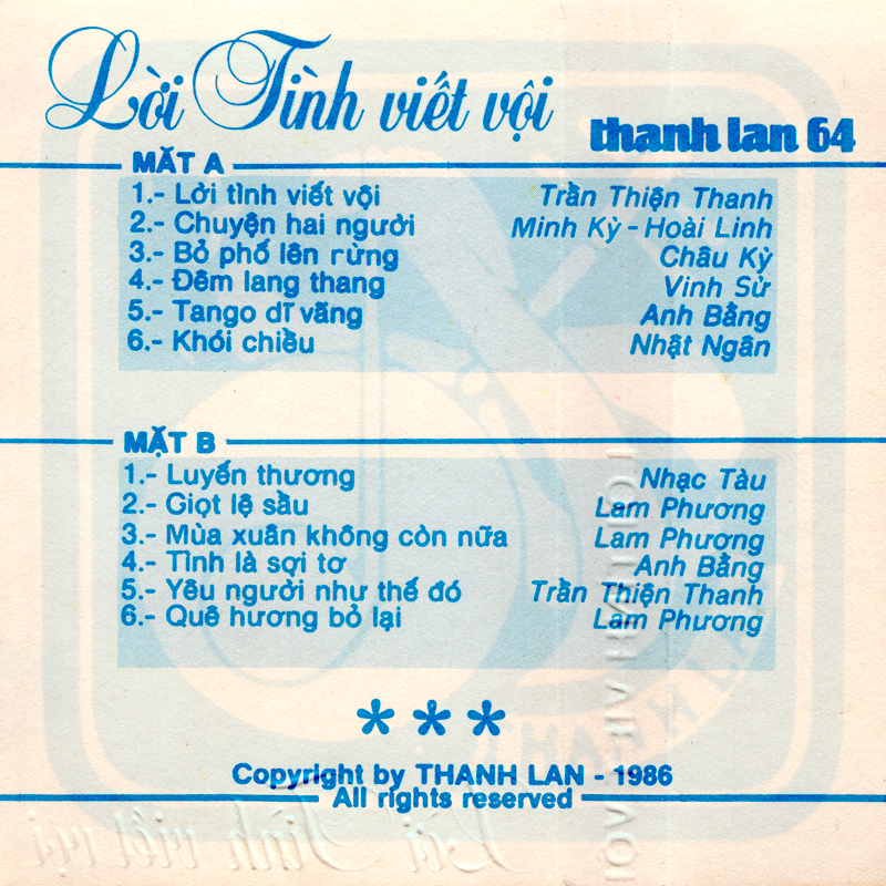 Tape Thanh Lan 64 - Thanh Tuyền - Lời Tình Viết Vội (WAV)